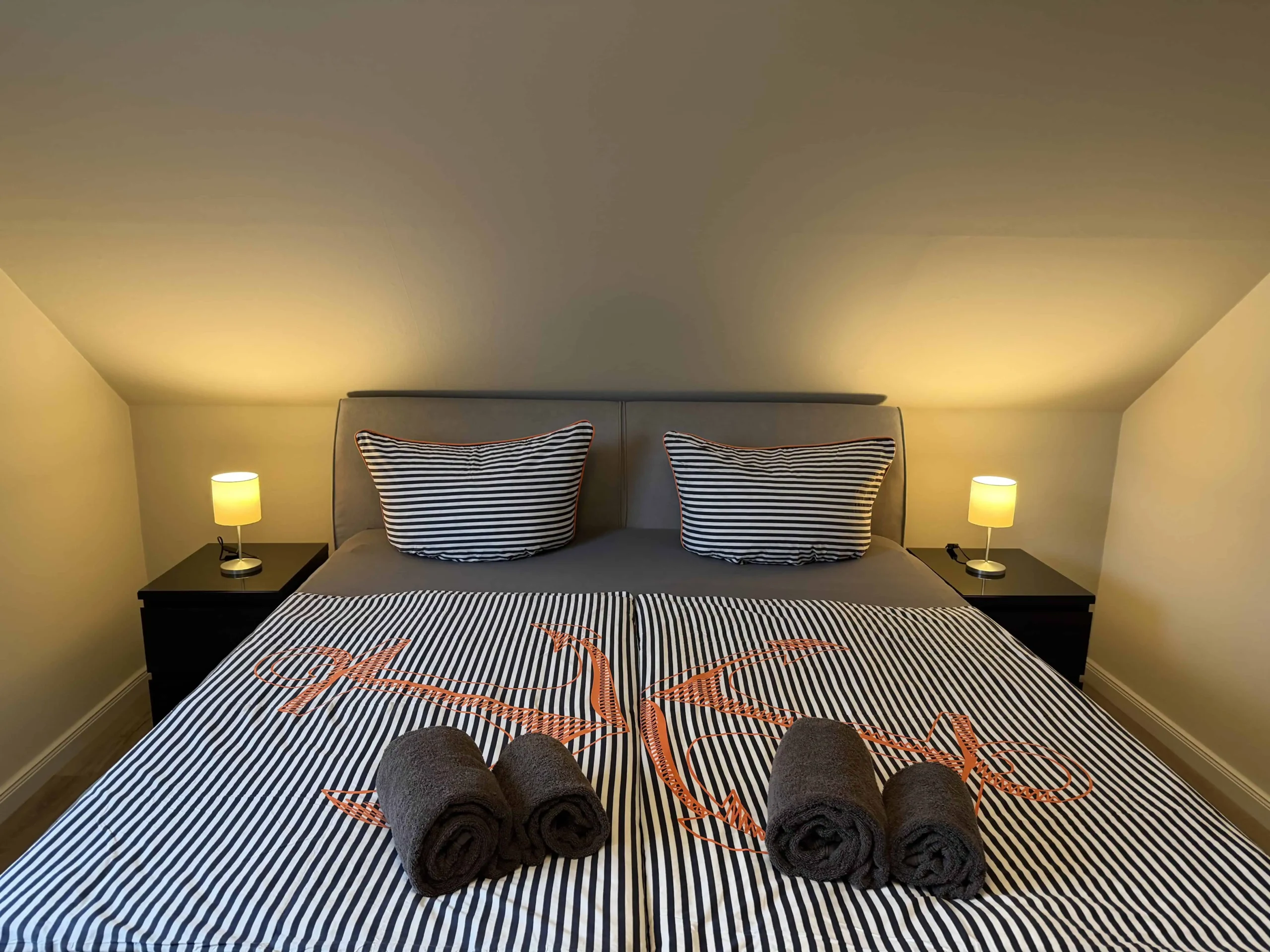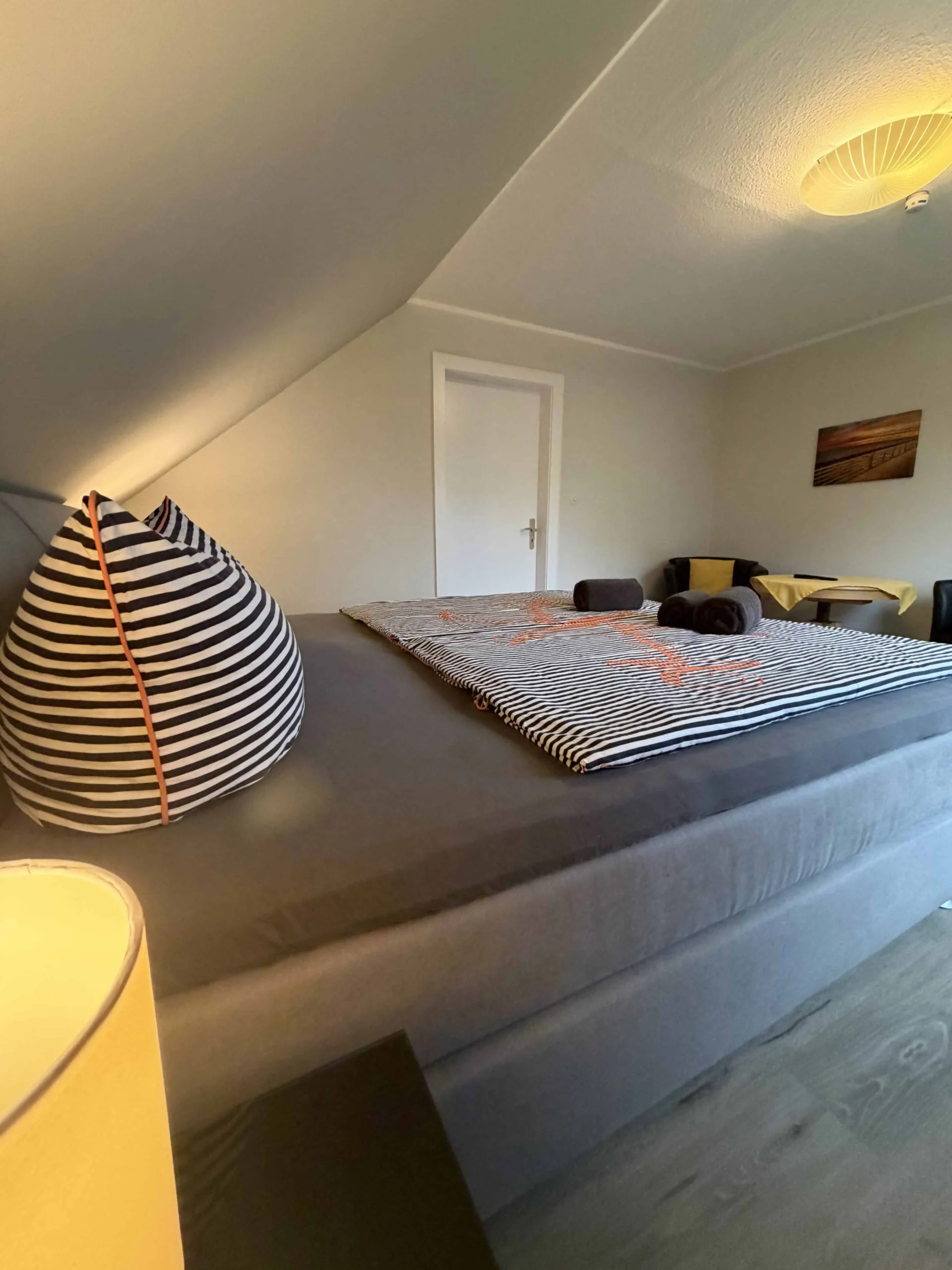 Dieser Schlafraum ist mit einem Boxspringbett 180cm x 200cm, einem Kleiderschrank und einem Fernseher ausgestattet. Ein Waschbecken befindet sich im Schlafraum, das separate Duschbad mit WC befindet sich gegenüber des Schlafraums und ist über den Flur erreichbar.