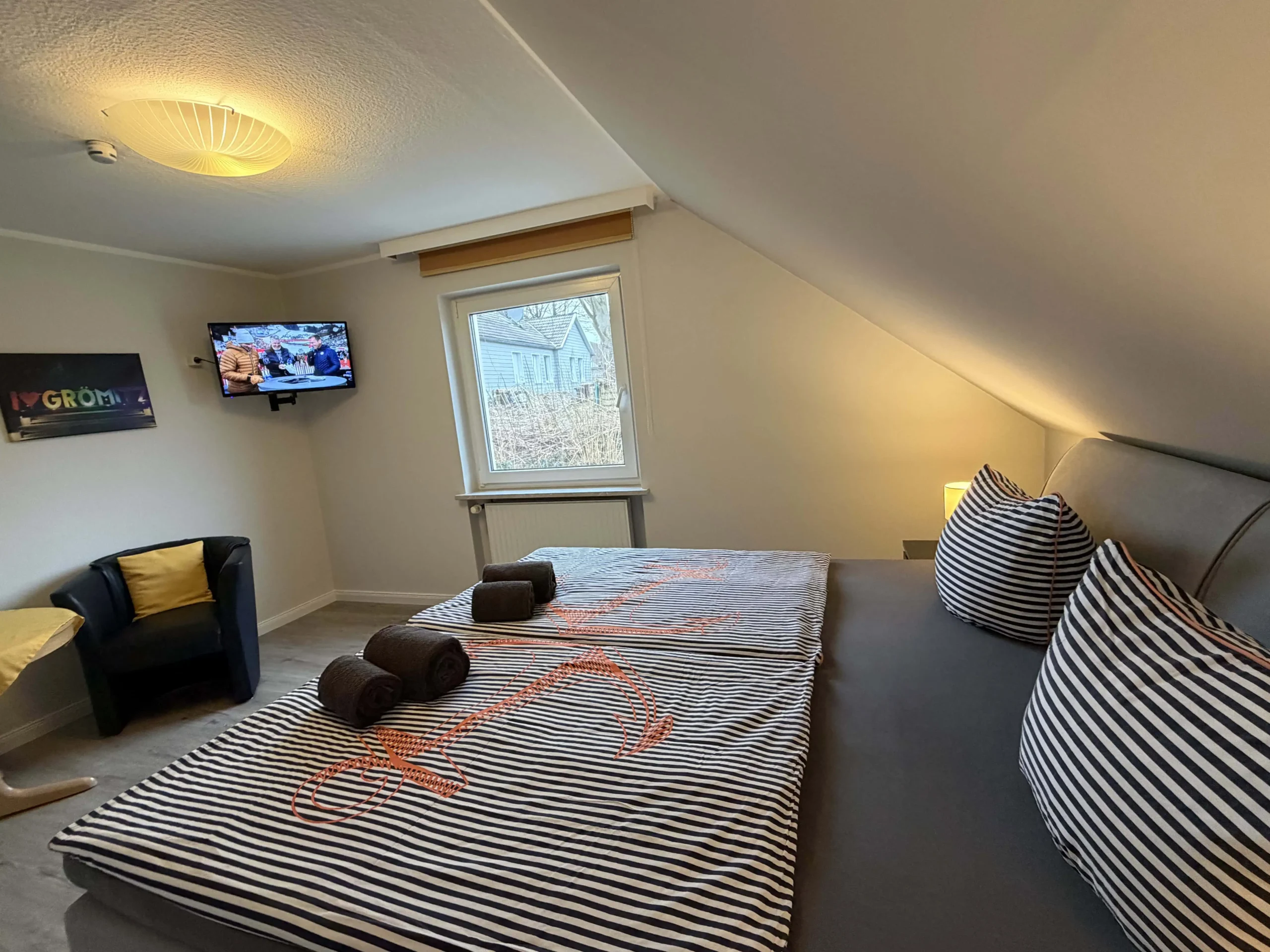 Dieser Schlafraum ist mit einem komfortablen Boxspringbett, einem geräumigen Kleiderschrank, einer gemütlichen kleinen Sitzecke sowie einem Fernseher ausgestattet.