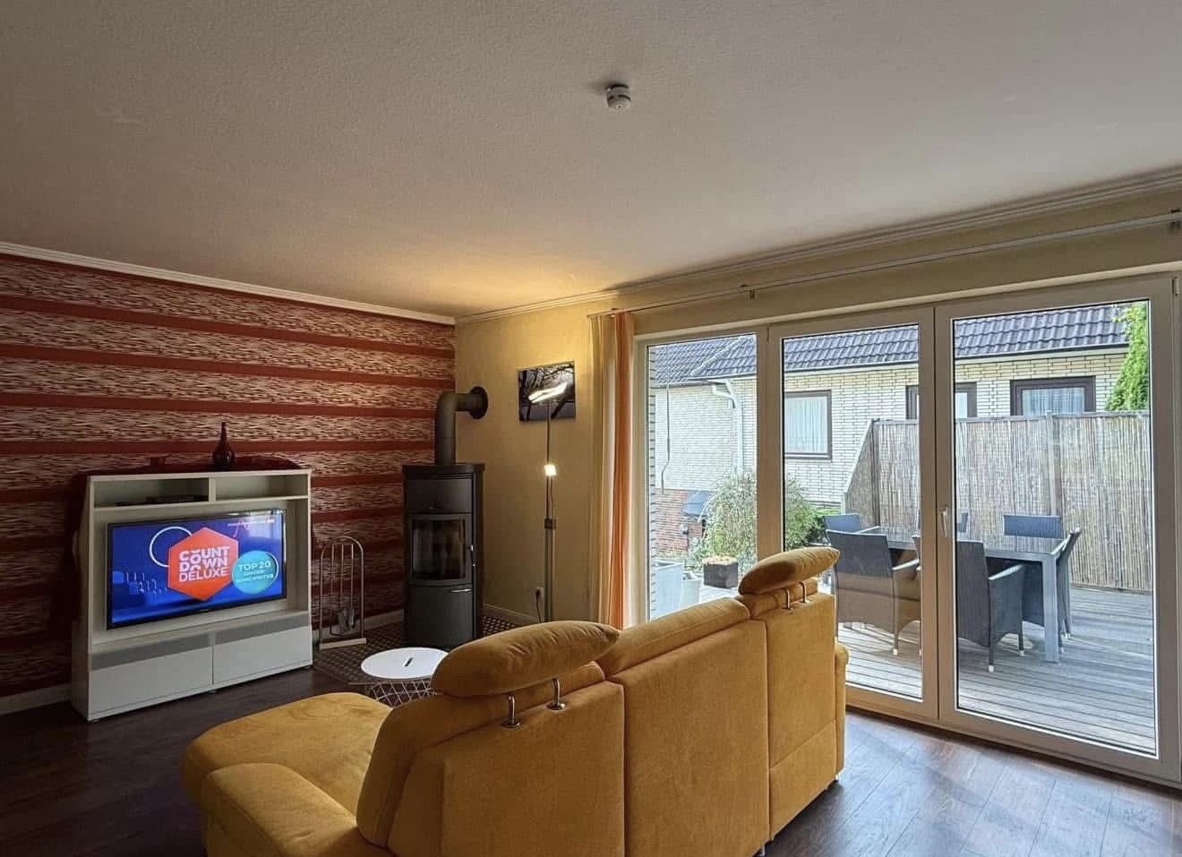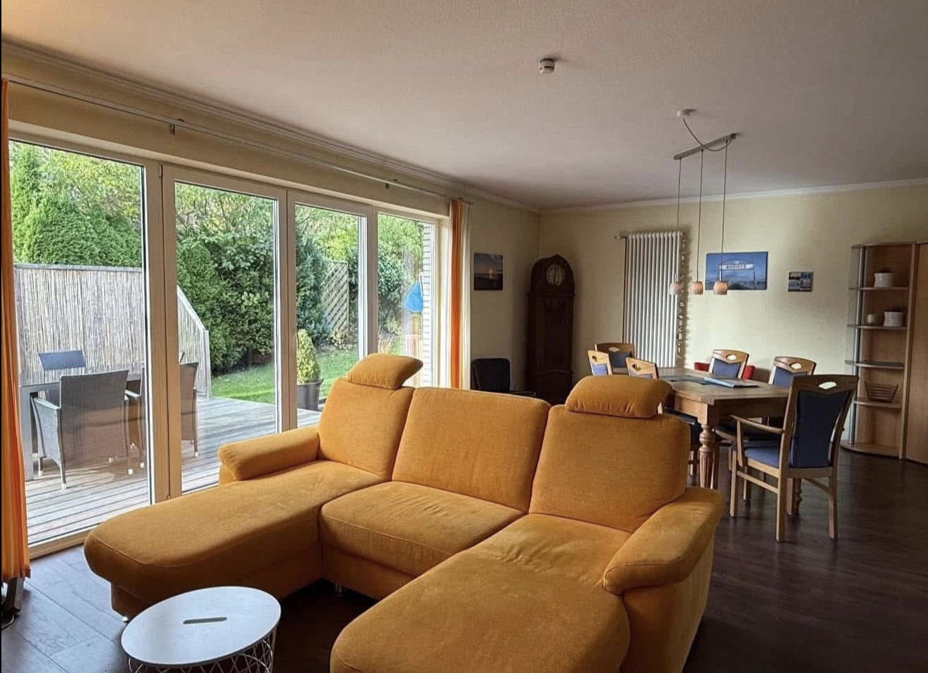 Vom Wohnbereich und vom Schlafraum 1 gelangt ihr auf die möblierte Südterrasse mit einem eigenen Strandkorb, einer Markise und einem Grill.