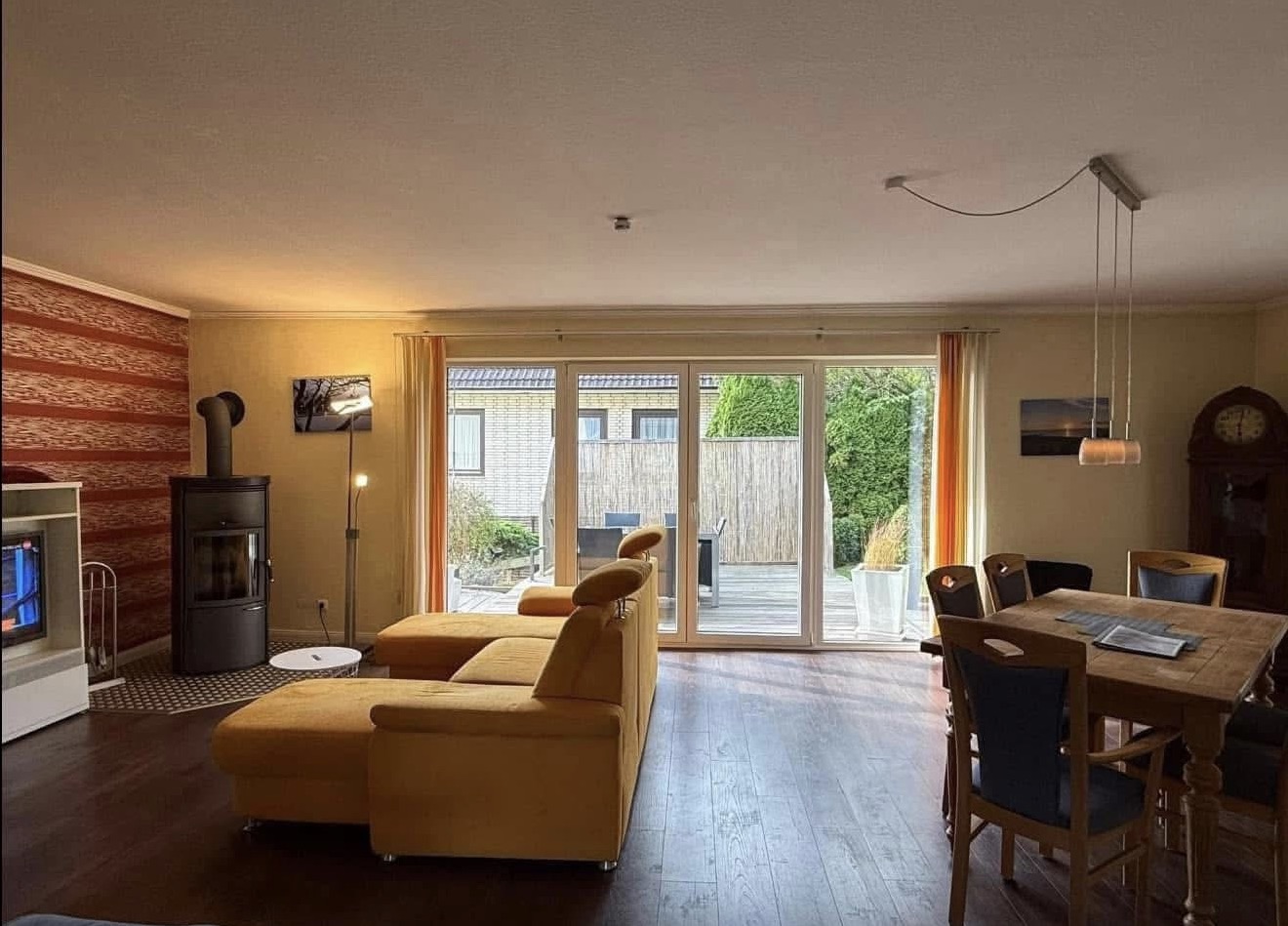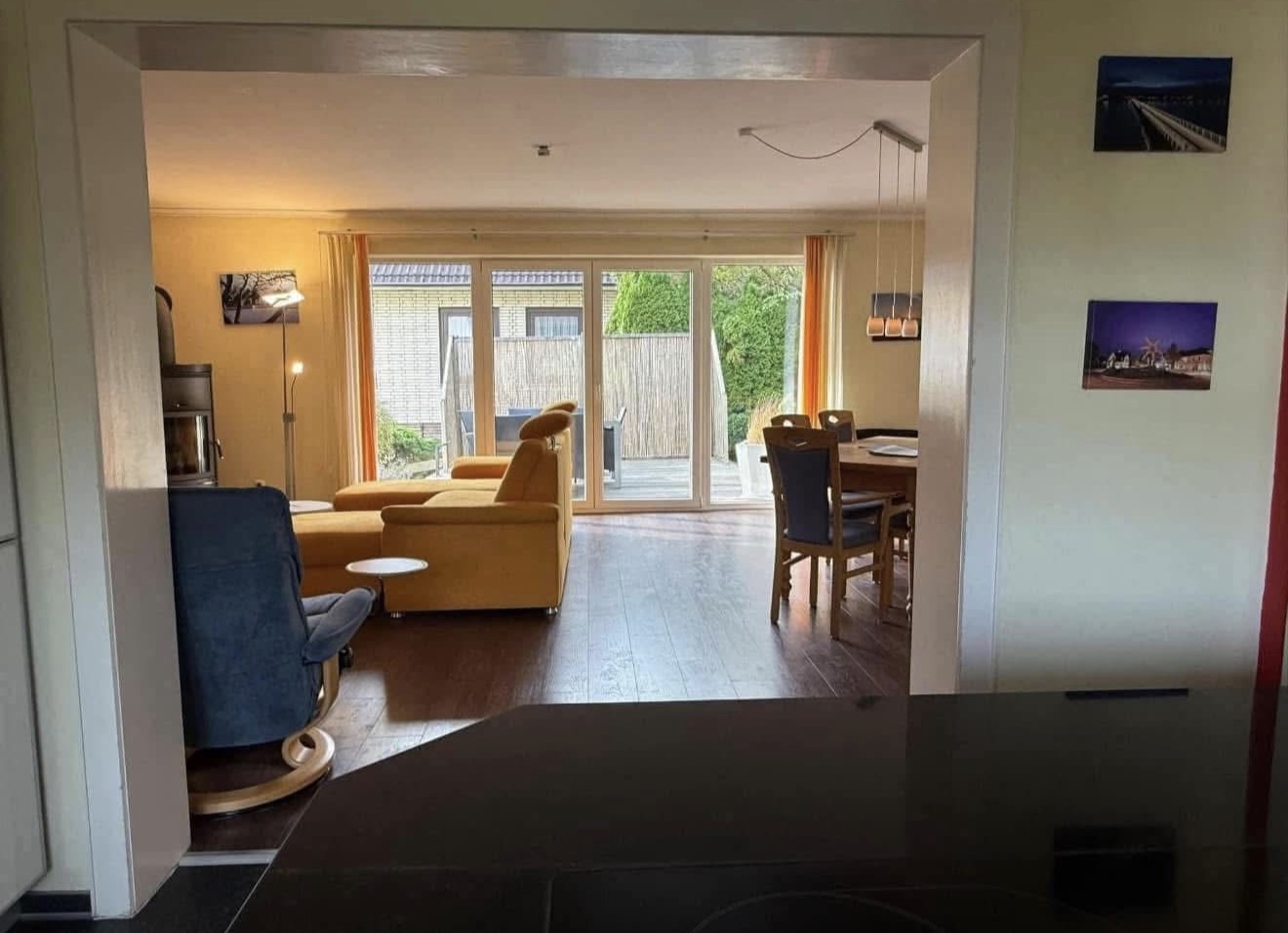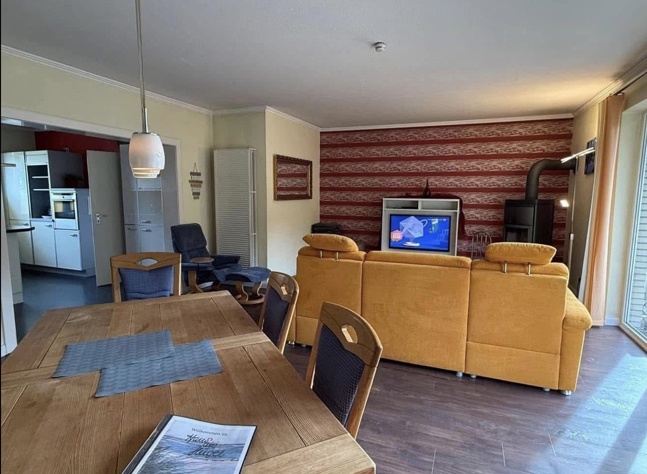 Der gemütliche Wohnbereich ist mit komfortabler Sitzgarnitur und einem Fernseher ausgestattet. Ein Essbereich für 6 Personen schließt an den Wohnbereich an. Ein Hochstuhl für Kleinkinder steht euch auf Anfrage ebenfalls zur Verfügung.